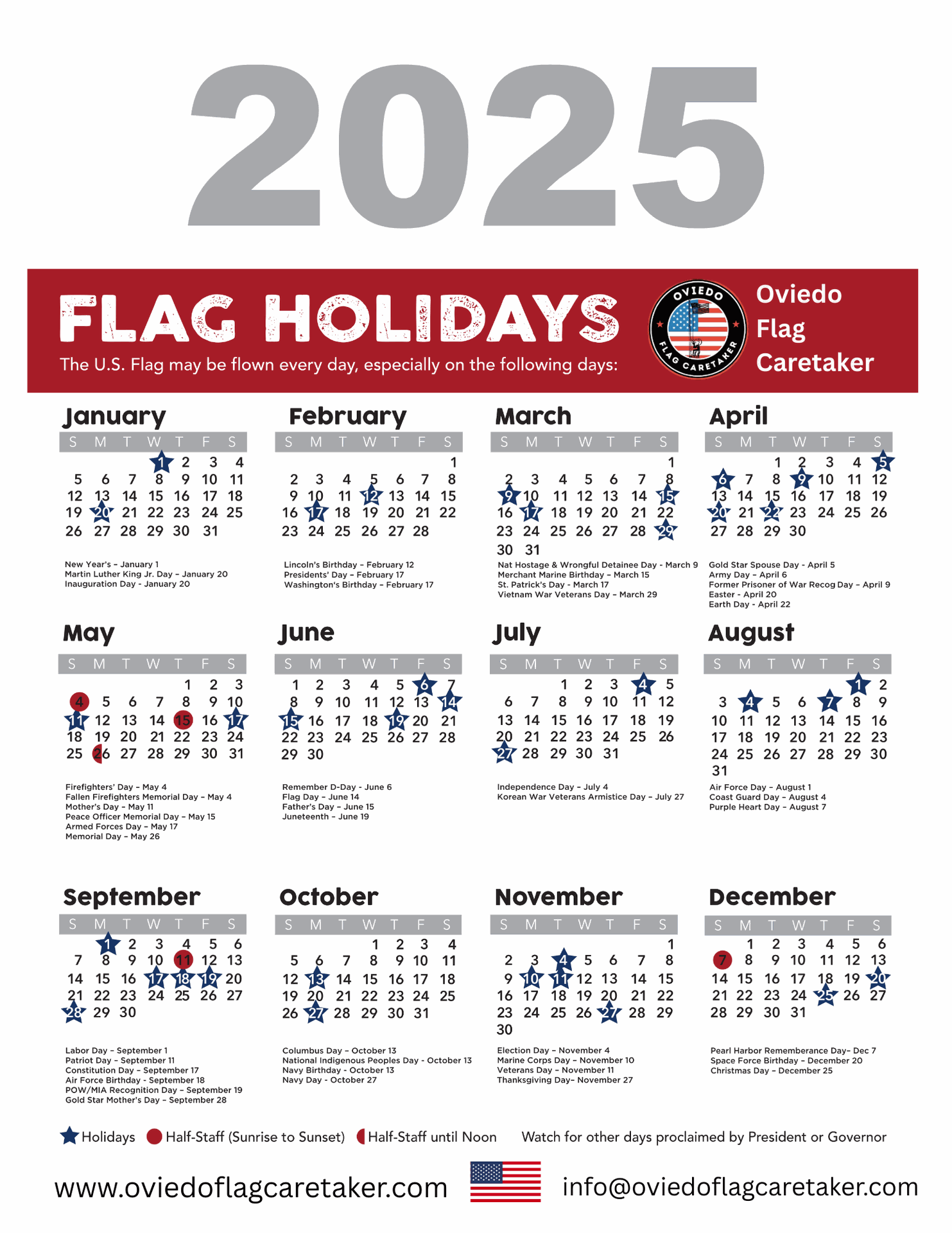 The American Flag can be flown everyday, but especially on the holidays listed below. Holidays that require flags at half-staff are indicated in the key. Download our free flag flying day calendar and never miss a flag flying day.